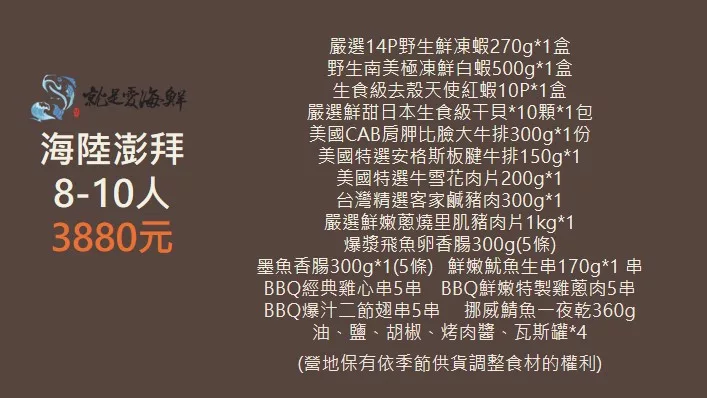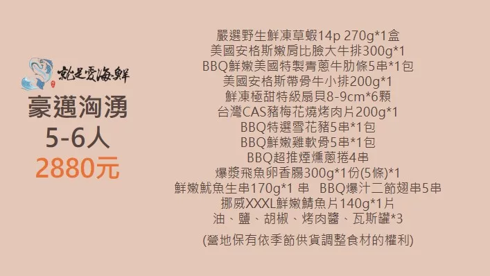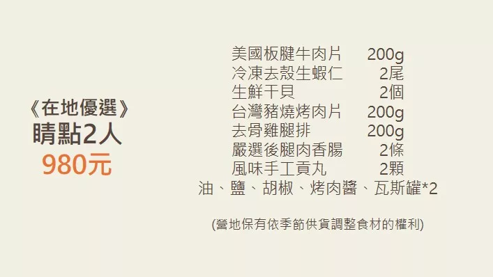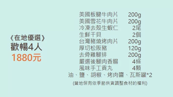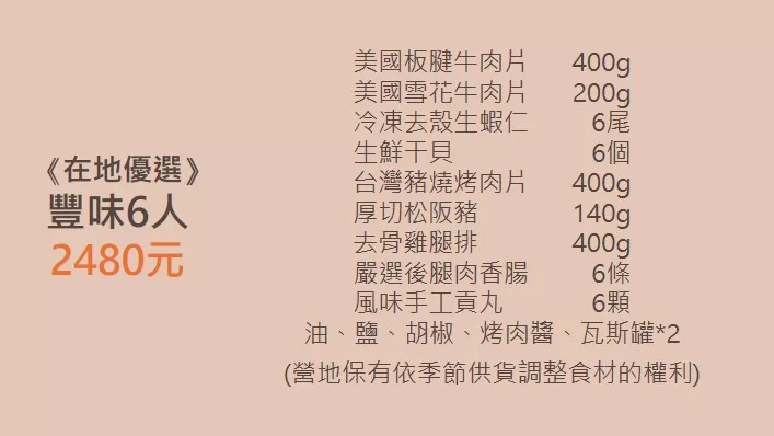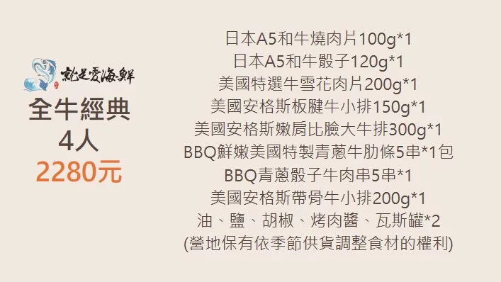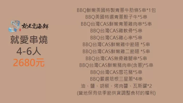 柚香露露的烤肉食材與”就是愛海鮮”合作,嚴選優良鮮純的食材,製作及運送層層把關,全程冷凍送達營地。
